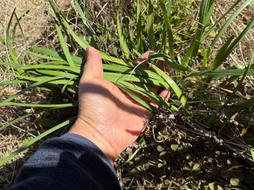 え~~~と、裏庭にニラを探しに行きました