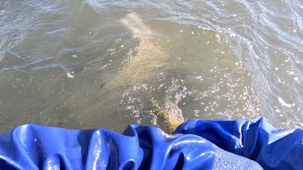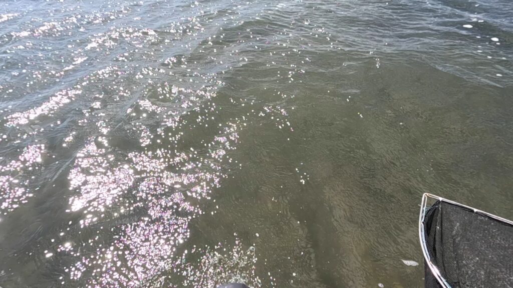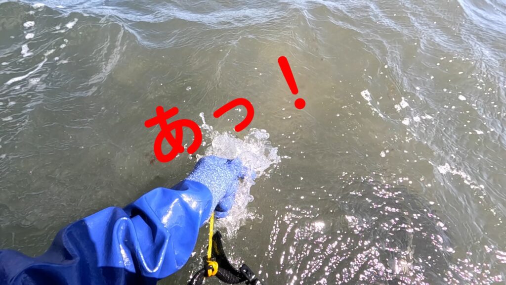 私の落ち牡蠣拾いのやり方は、足裏の感覚で牡蠣を探し当て網をセットし、網の中へ牡蠣を蹴混むというやり方